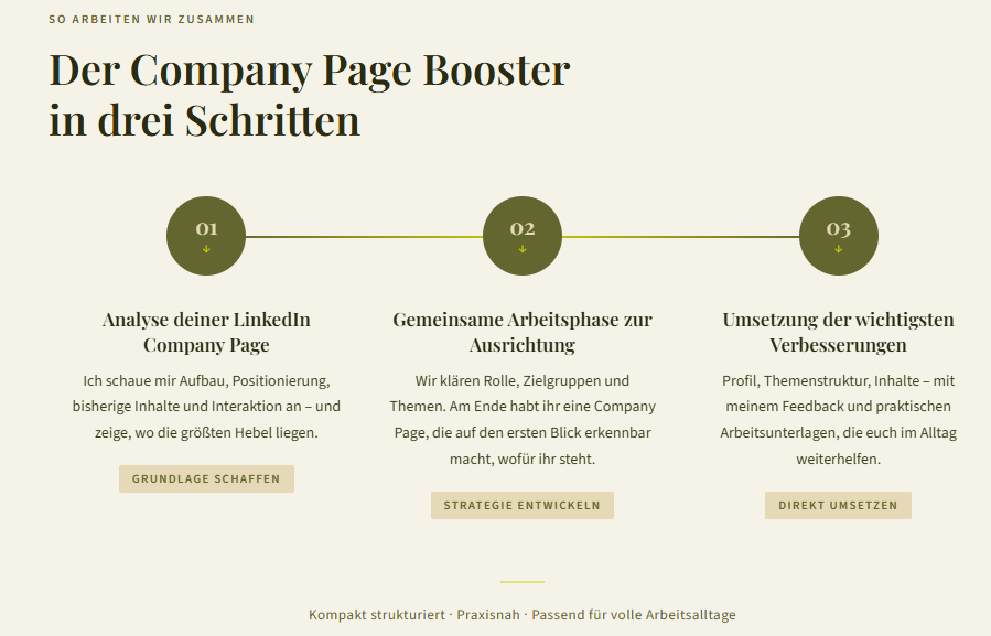 Im Company Page Booster bündelt sich diese Erfahrung in einem klar strukturierten Prozess. Du erhältst keine allgemeinen Tipps, sondern eine fundierte Einordnung, klare Empfehlungen und gezieltes Sparring an den entscheidenden Stellen. So entsteht ein Unternehmensauftritt, der fachlich trägt, kommunikativ stimmig ist und sich im Arbeitsalltag bewährt.
